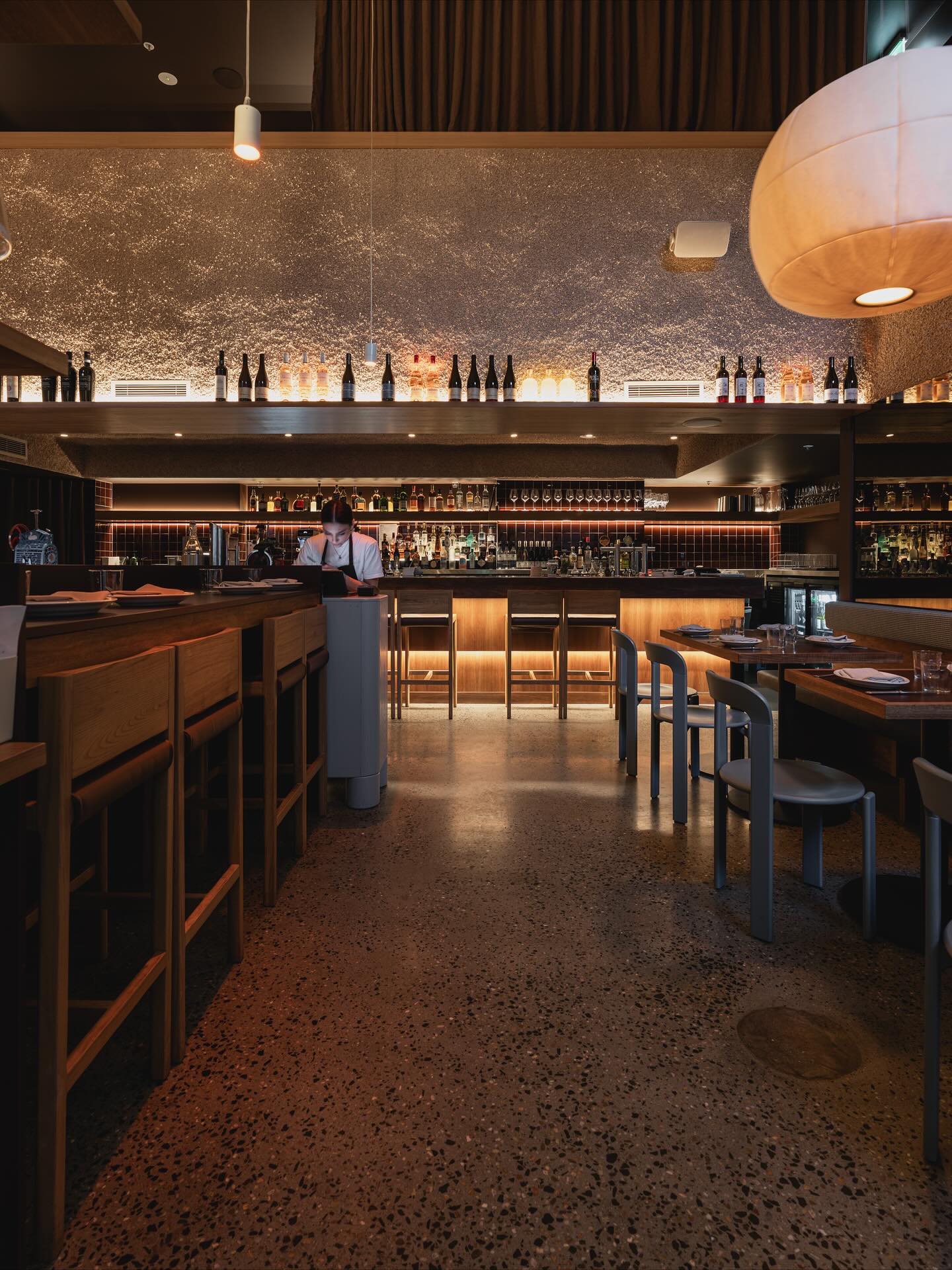 Vary Projects elevated 17 Longland Street into a retro-chic Italian sanctuary, blending Bauhaus elegance with warm, textured intimacy. Frosted glass whispers divide spaces, while popcorn walls and blue-maroon tiles in burnt orange and navy hues craft a premium, mature allure—seating 75 indoors, 25 al fresco, plus a mezzanine for bespoke gatherings. Our fitout harmonizes sophisticated simplicity with playful nods: metal accents, curated shelving for 100+ European-Australian wines, and fluid flow for lingering evenings of tequila-infused cocktails and luxe pastas. A timeless embrace of neighbourhood sophistication.